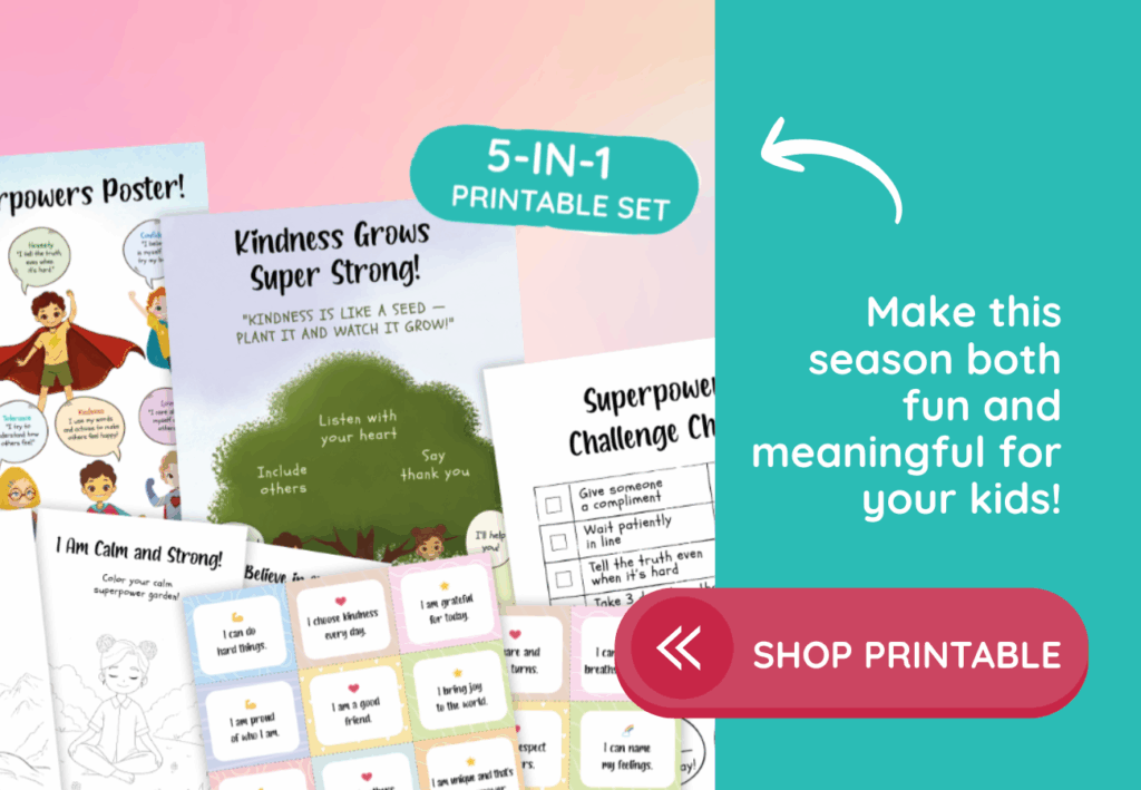 One way to do this is with our Superpower Affirmation Printable Bundle. This bundle includes six printable tools designed to help children explore emotions, practice kindness, and build positive habits — perfect for holiday downtime, cozy reading corners, or family bonding moments.