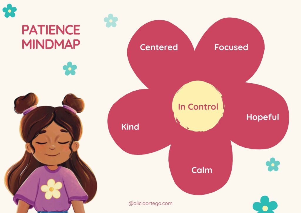The worksheet above helps kids get the idea of what patience is and encourages them to do some creative thinking of their own by guiding them to look at each “petal,” name the feeling it represents, talk about moments when they have felt this way, and explore how these calm and positive states can help them wait, stay focused, and manage emotions. It also gives you a simple way to engage kids in discussion, role-play, and reflection — for example, by asking them to choose which feeling they want to use in a waiting situation, describe how that feeling looks or sounds, or add their own “patience words” to the mindmap.
