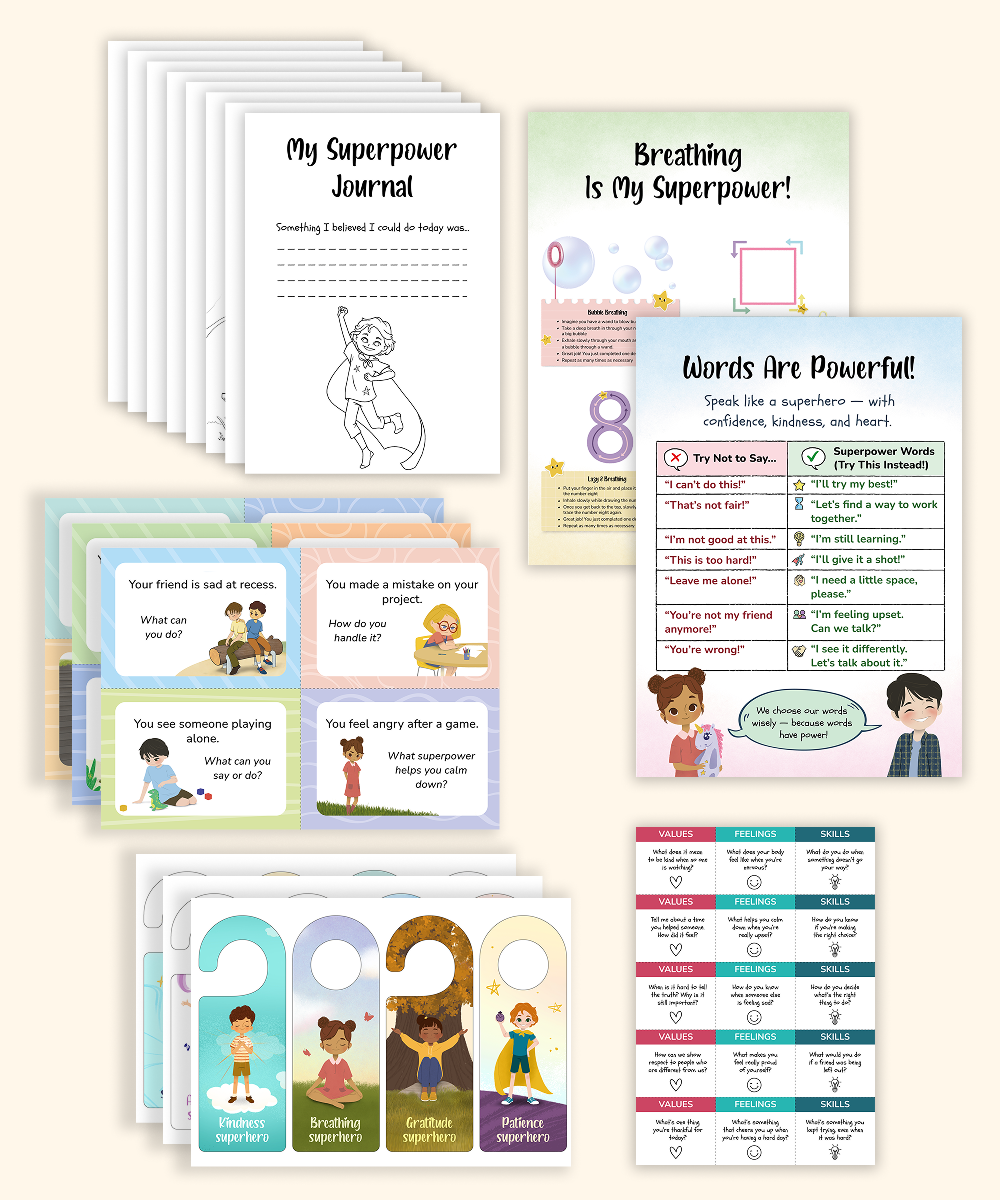 Superpower Printable Bundle for Kids | 6 SEL Tools for Classroom and Home | Emotions Mindfulness Kindness Confidence